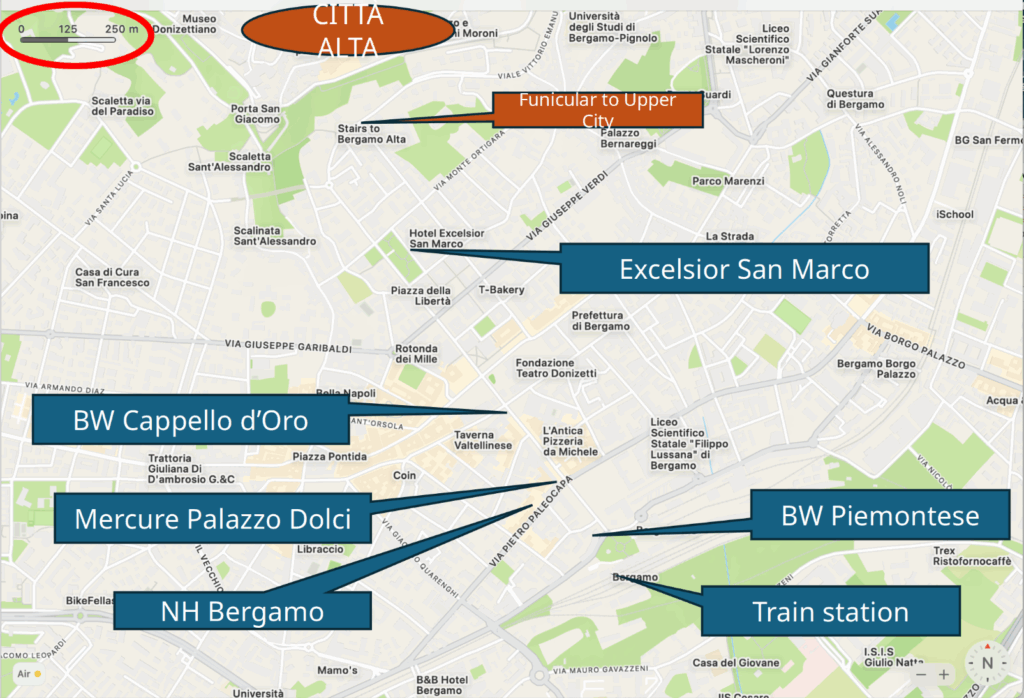 Carte de Bergame montrant l’emplacement de quelques hôtels – notez l’échelle dans l’ovale rouge