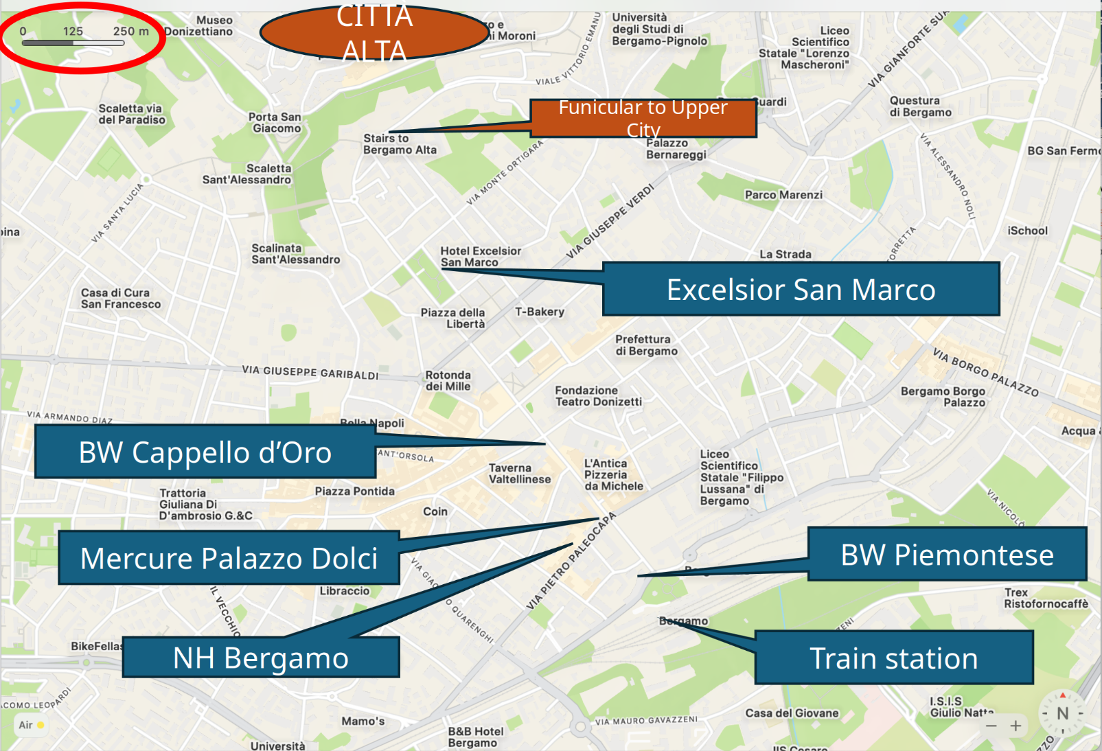 Carte de Bergame montrant l’emplacement de quelques hôtels – notez l’échelle dans l’ovale rouge